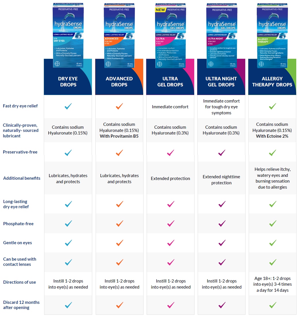 hydraSense® eye drops provide fast, effective, and long-lasting relief for dry eyes. They are phosphate-free and preservative-free eye drops which can be used with contact lenses. They contain a naturally sourced lubricant called sodium hyaluronate, which is clinically proven to hydrate, lubricate and protect your eyes.